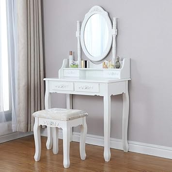 Exqui Coiffeuse Vintage Shabby Chic Avec Miroir 4 Tiroirs Amd Pour Chambre A Coucher Salle De Bain 75 X 40 X 140 Cm S323 4 W Blanc